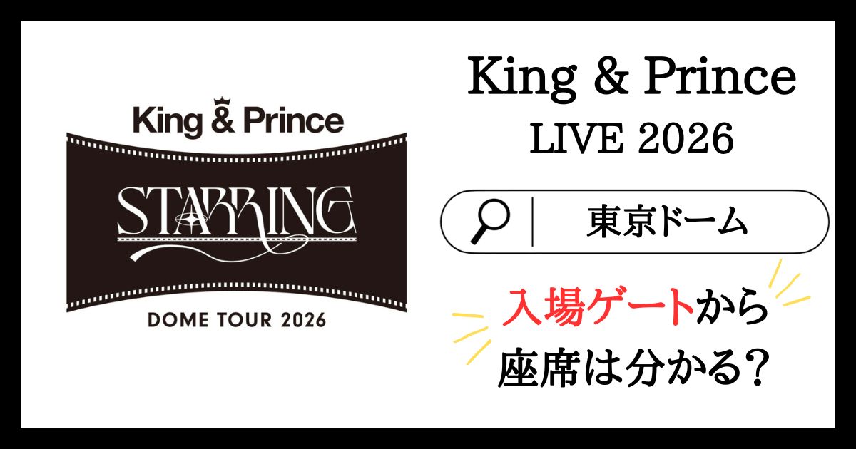 2026年2月18日・19日に東京ドームにて開催されるKing&Princeのライブ「King & Prince DOME TOUR 2026 STARRING」での、入場ゲートと座席についてご紹介していきました。