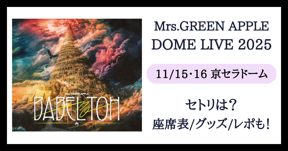 ミセスのバベルの塔「Mrs.GREEN APPLE DOME TOUR 2025 “BABEL no TOH”」2025年11月15日・16日京セラドーム大阪で開催される、大阪公演でのミセスの曲名や曲順などのセトリ、ステージ構成などの座席表、物販やグッズ情報、感想レポを調査しご紹介していきました。