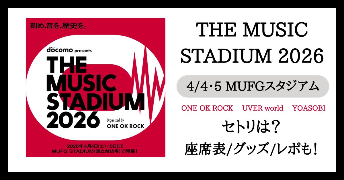 今回は、「docomo presents THE MUSIC STADIUM 2026 organized by ONE OK ROCK」2026年4月4日・5日MUFGスタジアム(国立競技場)での、ONE OK ROCK・UVER world・YOASOBIが歌う曲名や曲順などのセトリ、MUFGスタジアムのステージ構成や座席表、物販やグッズ売り切れ情報、感想レポを調査してご紹介していきます。