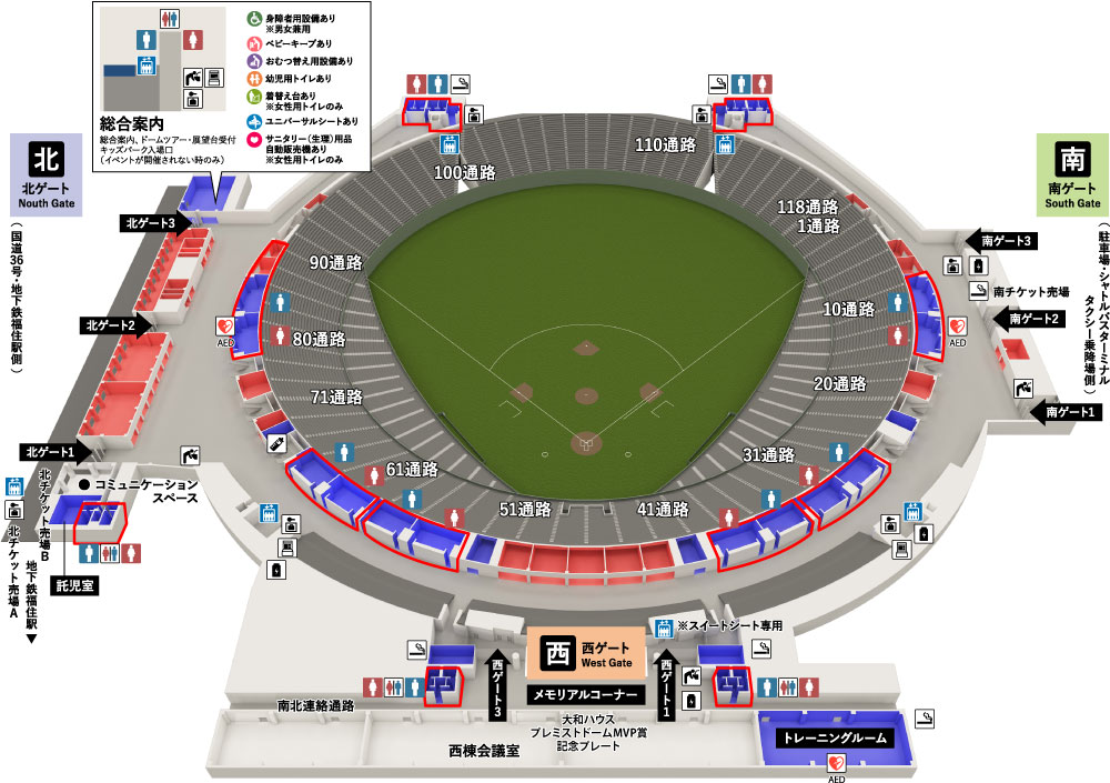 大和ハウスプレミストドームの入場ゲートは、北ゲート、南ゲート、西ゲート、東ゲートの4つです。
