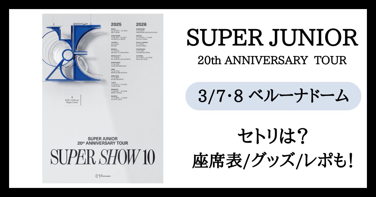 「SUPER JUNIOR 20th Anniversary TOUR <SUPER SHOW 10> in JAPAN」の2026年3月7日・8日ベルーナドーム公演でのSUPER JUNIORの曲名や曲順などのセトリ、ステージ構成などの座席表、物販やグッズ情報、レポを調査し、ご紹介していきます。