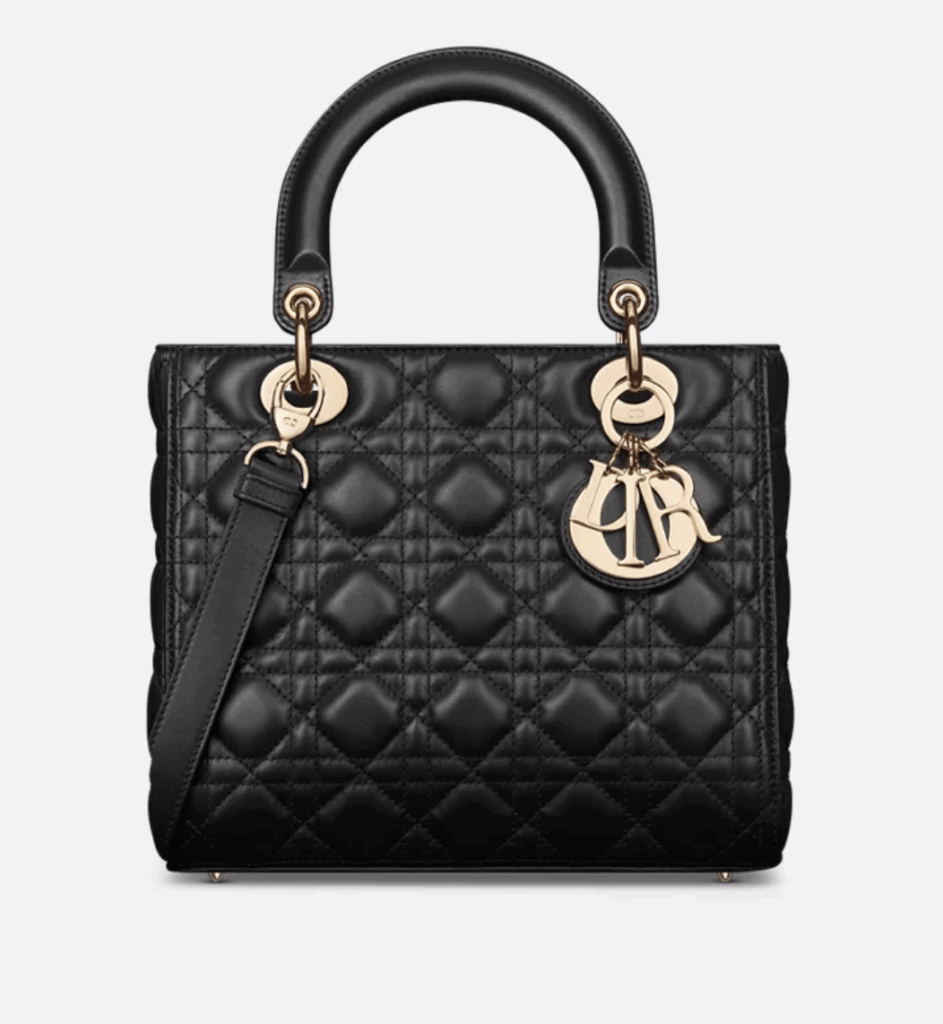 Lady Diorは「カナージュ」と呼ばれるキルティング地が美しいエレガントなバッグで、ゴールドトーンのDIORチャームが上品さを際立たせます。