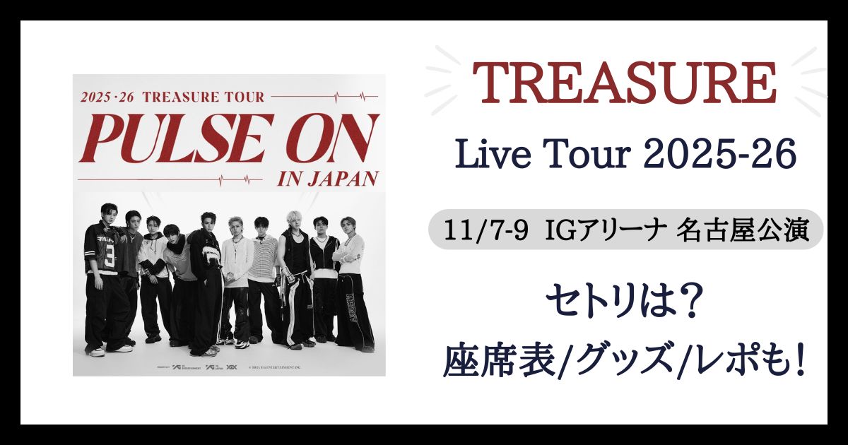 この記事では、TREASUREライブツアー「2025-26 TREASURE TOUR [PULSE ON] IN JAPAN」11月7日〜9日にIGアリーナで開催される名古屋公演での、曲名や曲順などのセトリ、ステージ構成などの座席表、物販やグッズ情報、感想レポを調査しご紹介していきます。