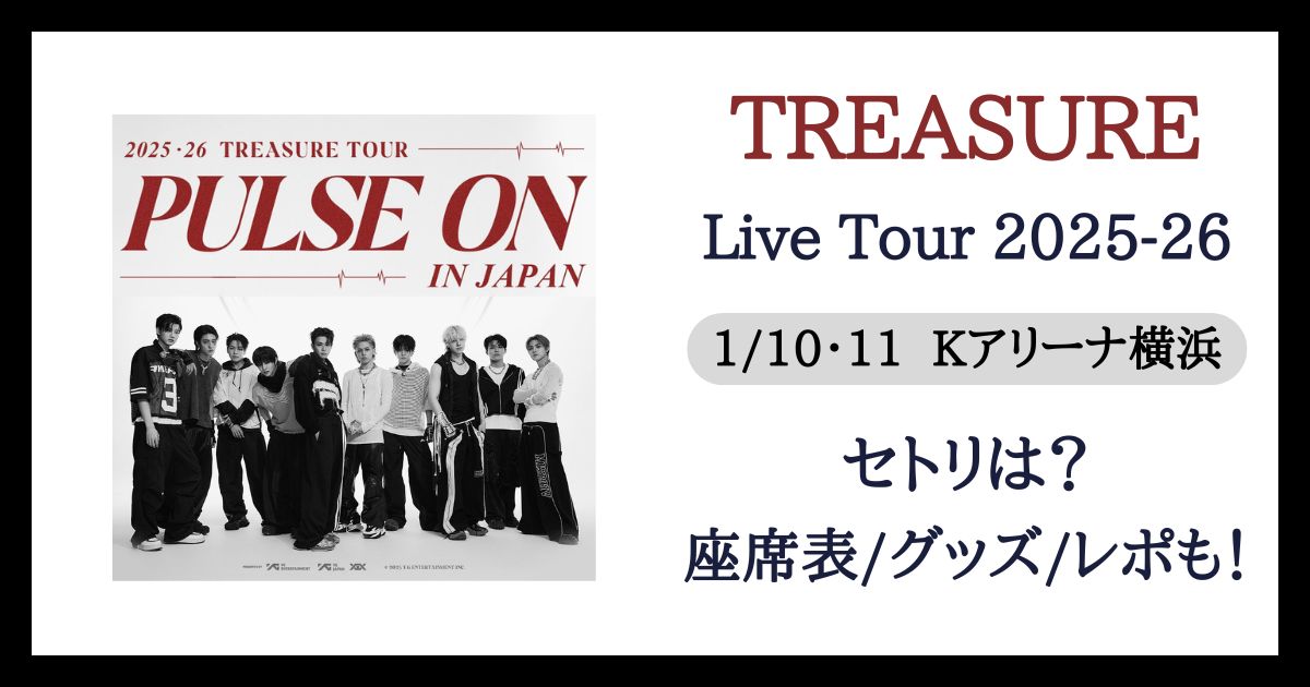 TREASUREライブツアー「2025-26 TREASURE TOUR [PULSE ON] IN JAPAN」2025年11月22日・23日と2026年1月10日・11日にKアリーナ横浜で開催される横浜公演での、曲名や曲順などのセトリ、ステージ構成などの座席表、物販やグッズ情報、感想レポを調査しご紹介していきました。