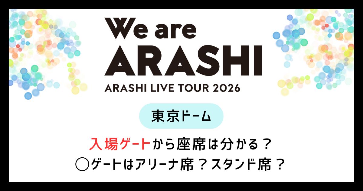 2026年4月1日・2日・5月31日に東京ドームにて開催されるARASHI LIVE TOUR 2026「We are ARASHI」での、入場ゲートと座席についてご紹介していきました。